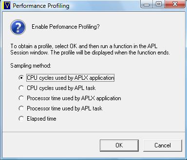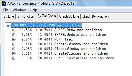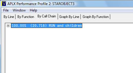 OverviewPerformance profiling can be used to find out which parts of your APL code take the most time to execute, or are executed most often, and so helps you to determine which functions to concentrate on when optimising performance. You can view the performance data in a number of different ways, and easily 'drill down' to get more detail on exactly where execution time is spent. You can either use the very easy menu-based profiling described below, or for more detailed control use Profiling using the Tools menuFor simple profiling you can enable profiling through the APLX Tools menu. You then run the code to be profiled. When the code completes and APLX returns to desktop calculator mode, the profile is automatically shown in a Profile window. When you select 'Performance Profiling' from the Tools menu, APLX brings up a dialog which offers you a choice of different methods for measuring the execution time: ![]() Depending on which platform you are using, one or more of the timing methods may not be available. For example, earlier versions of Windows cannot measure the number of CPU cycles used by an application. If the method specified is not available it will be disabled in the dialog. Measuring CPU cycles, if available, usually gives the most accurate results. (See the description of Once you click OK on this dialog, profiling is enabled. You then run your APL code (a function, which in turn will typically call many other functions, and can ask for input from the user as part of its operation). As soon as the function finally completes or is interrupted, and APL returns to desk calculator mode, profiling is automatically disabled and the results window will open. In this example (based on the HELPOBJECTS workspace supplied with APLX in library 10), we have executed a function called ![]() As you can see, the results are displayed on five tabs. The first tab ("By Line") tells you which individual function lines have taken the most CPU (or elapsed) time, as shown above. They are initially sorted with the one which has taken the most time first, but you can change the sort criteria by clicking on the header of a column. CPU usage by lineIn our example, the function line which has been most CPU-intensive is line 6 of The critical information is usually in the column shown as 'Self Only'. This relates to the CPU usage for the line itself, excluding any functions called by the line. The next column ('Self+Children') displays the time taken both in the line itself and in any functions called. In our example, line 12 of By selecting the 'Graph By Line' tab, you can get an immediate graphical representation of which lines took the most CPU time: ![]() CPU usage by functionAs well as looking at individual lines, you can also get an overview of which functions (and methods) took the most time, by selecting the second tab of the results window ('By Function'): ![]() From this display you can 'drill down' within a given function, to find out where the time is spent in that function, by clicking on the twist-down by the function name: ![]() The 'Graph By Function' tab shows the overview by function as a pie chart. CPU usage by Call ChainThe third way of looking at the data is by call chain. This is best shown by our example: ![]() This shows that, unsurprisingly, 100% of the time was spent in our top-level function ![]() Saving the profiling data as a web pageAs well as looking at the data in the APLX window, you can select 'Save As Web Page' from the File menu. This saves a complete report (either as a summary of the most important items only, or of the whole application), as a web page which you can load in any standard browser. |